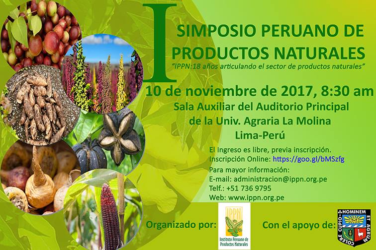 El Instituto Peruano de Productos Naturales organiza el I SIMPOSIO PERUANO DE PRODUCTOS NATURALES, se llevará a cabo el viernes 10 de noviembre de 2017, de 8:30 a 17:00 hrs., en la Universidad Nacional Agraria La Molina - Sala Auxiliar del Auditorio Principal, el cual está dirigido a empresas del sector de productos naturales.